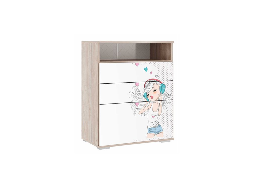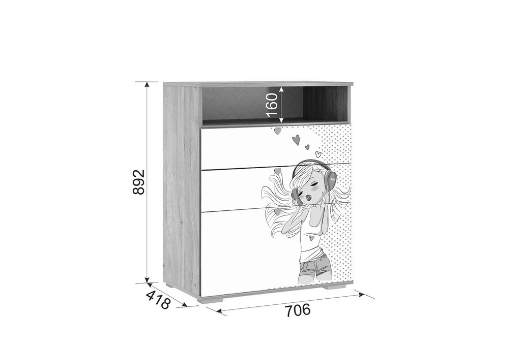 Стильный и модный комод «АЛИНА». В комоде много отделений в которые вы сможете разместить вещи, а ширина позволит использовать его, как тумбу ТВ. Ящики выкатные, открываются от нажатия (система PUSH to OPEN). Модный и стильный рисунок на фасадах и яркая ручка, придадут индивидуальность детской комнате. Принтерный рисунок устойчив к истиранию и ультрафиолету.