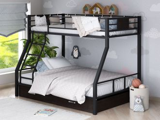 Конструкция кровати предусматривает спальные места разных размеров. В отличие от кроватей из ЛДСП выглядит менее громоздкой. В комплект входит прочная лестница, которую по Вашему желанию можно установить справа или слева.