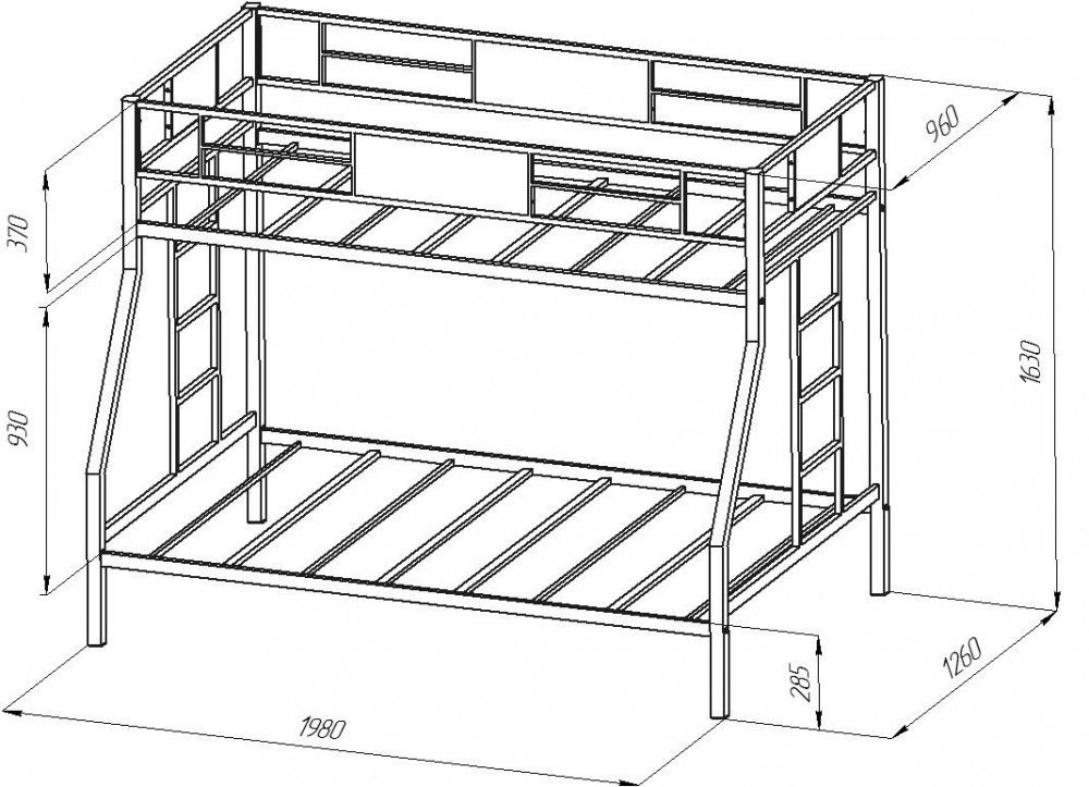 Конструкция кровати предусматривает спальные места разных размеров. В отличие от кроватей из ЛДСП выглядит менее громоздкой. В комплект входит прочная лестница, которую по Вашему желанию можно установить справа или слева.