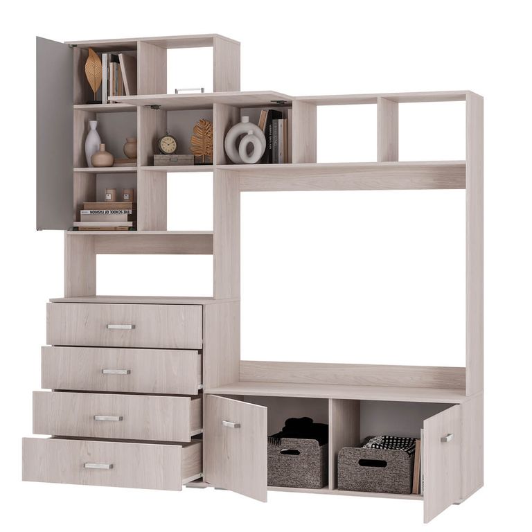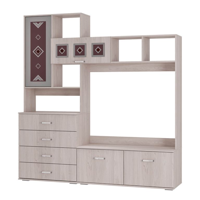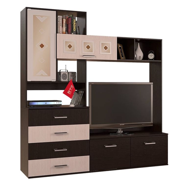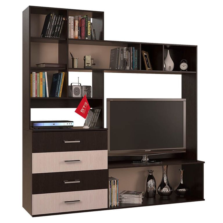 Центральная секция оснащена комодом, тумбой под ТВ, стеклостворкой под книги или посуду и полками под различные мелочи.