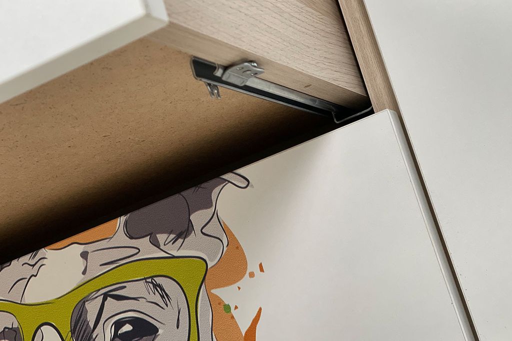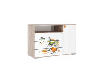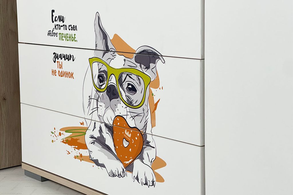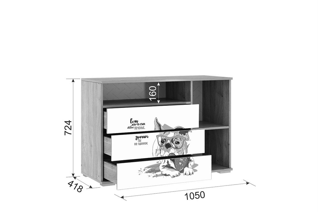 Стильный и модный комод «Зоо». В комоде много отделений в которые вы сможете разместить вещи, а ширина позволит использовать его, как тумбу ТВ. Ящики выкатные, открываются от нажатия (система PUSH to OPEN). Модный и стильный рисунок на фасадах и яркая ручка, придадут индивидуальность детской комнате. Принтерный рисунок устойчив к истиранию и ультрафиолету. Рисунок универсальный подходит, как для мальчиков, так и для девочек. Цветовое сочетание и позитивные надписи благотворно влияют на нежную психику ребенка. Комплектуется дополнительным модулем "Полкой-вкладышем 48" и "Доводчиком для петли 4-х шарнирной".