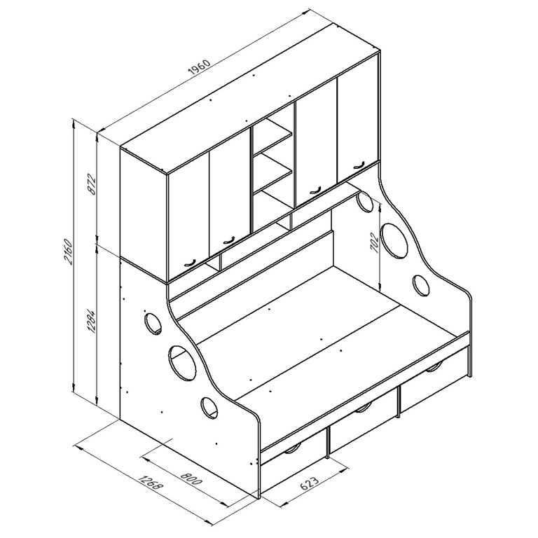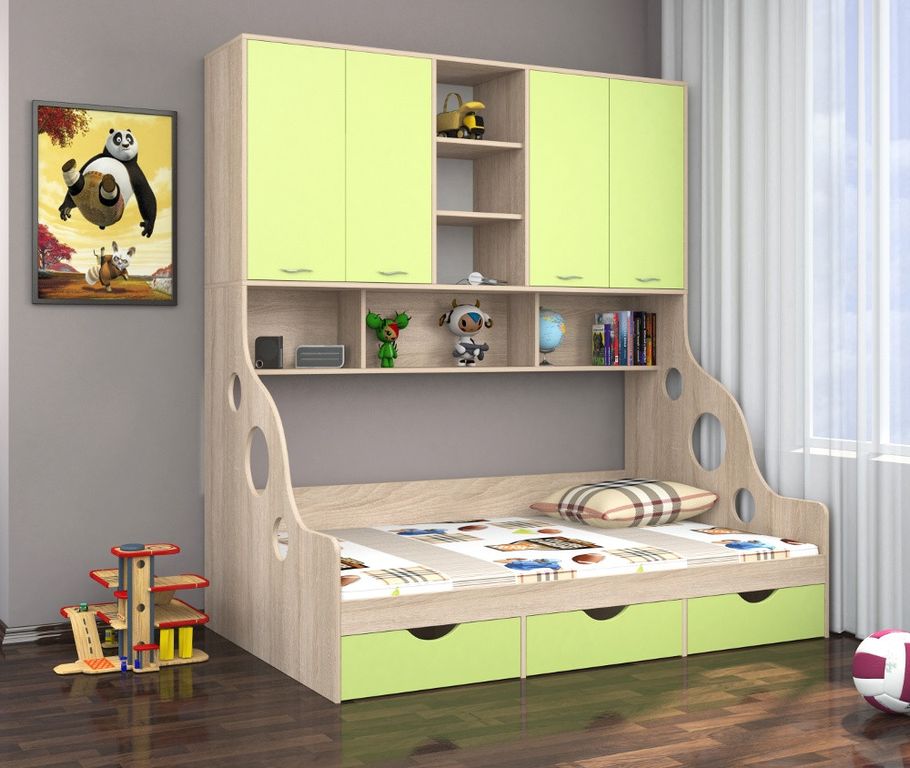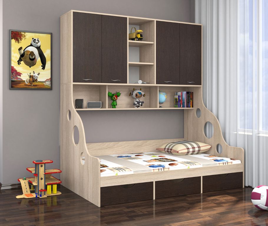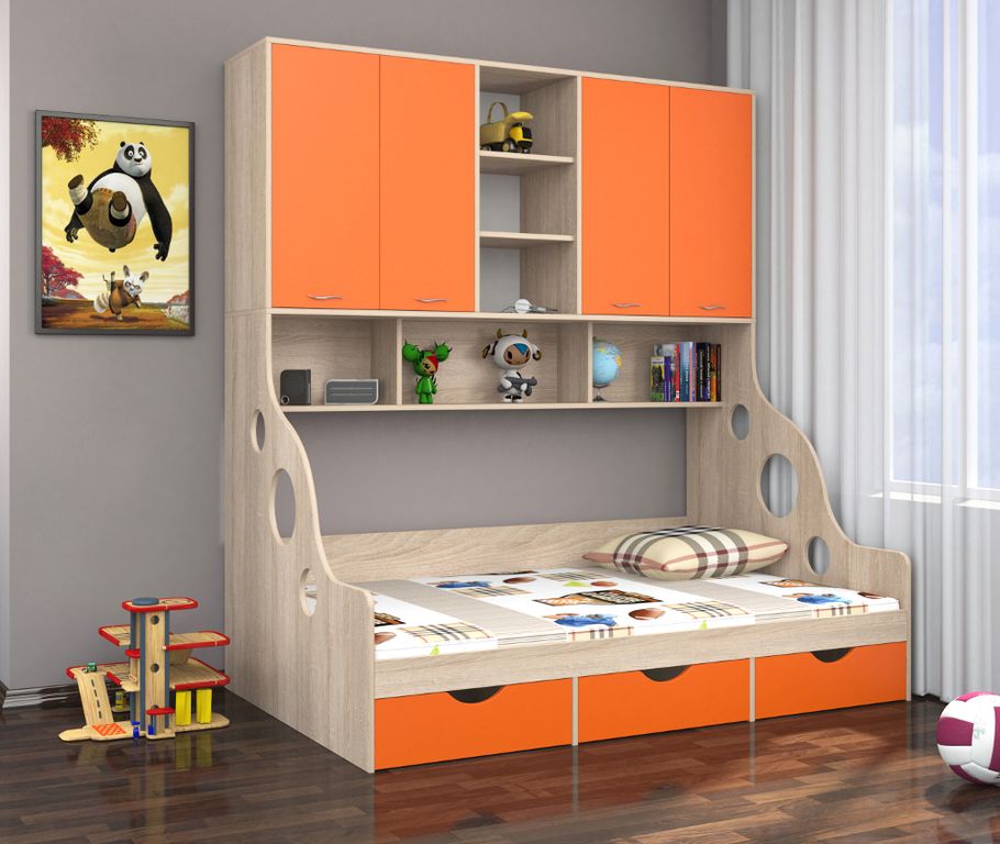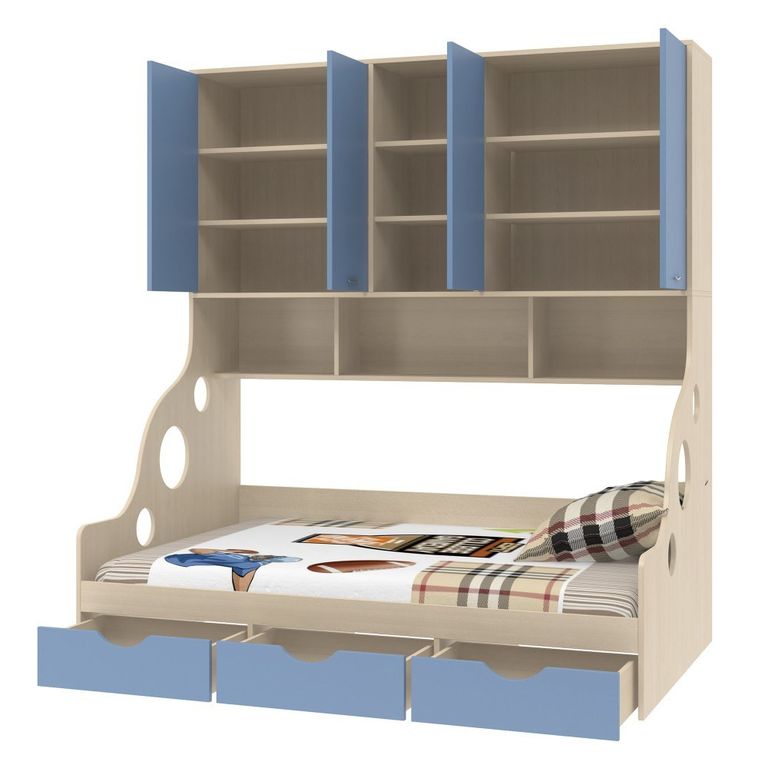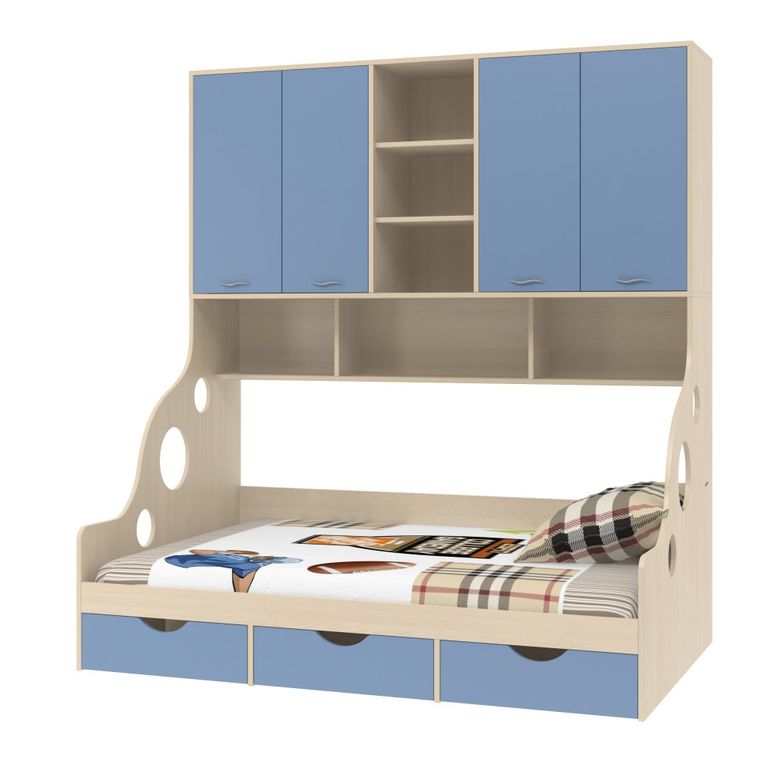 Кровать с антресолью Дельта - 21.01 представляет собой функциональный комплекс, совмещающий в себе расширенное спальное место с блоком вместительных антресолей, удобных для хранения книг, предметов декора, игрушек и других личных вещей. Антресоль состоит из трех открытых и шести закрытых за распашными дверями ниш. Внизу расположены три выкатных ящика, в которых можно хранить постельное белье или одежду. Этот комплекс можно успешно скомплектовать с другими подходящими элементами корпусной мебели серии Дельта.