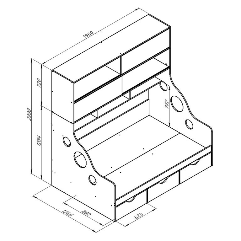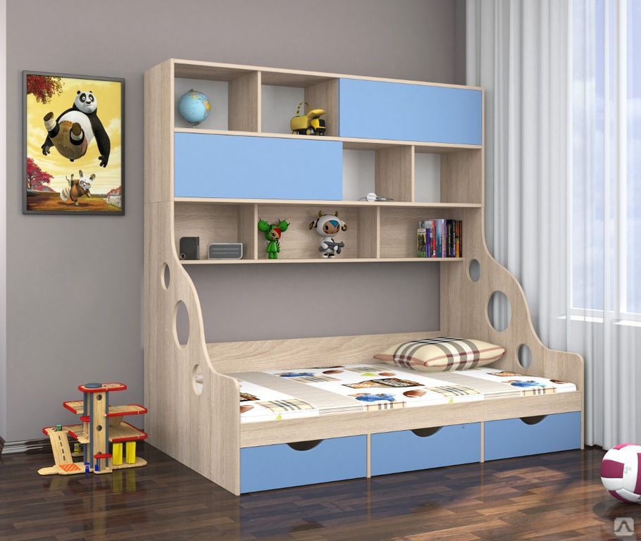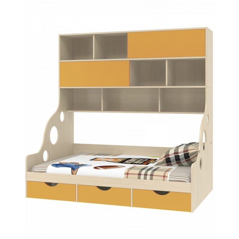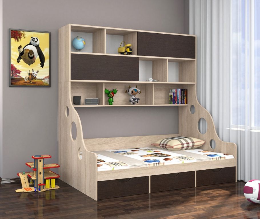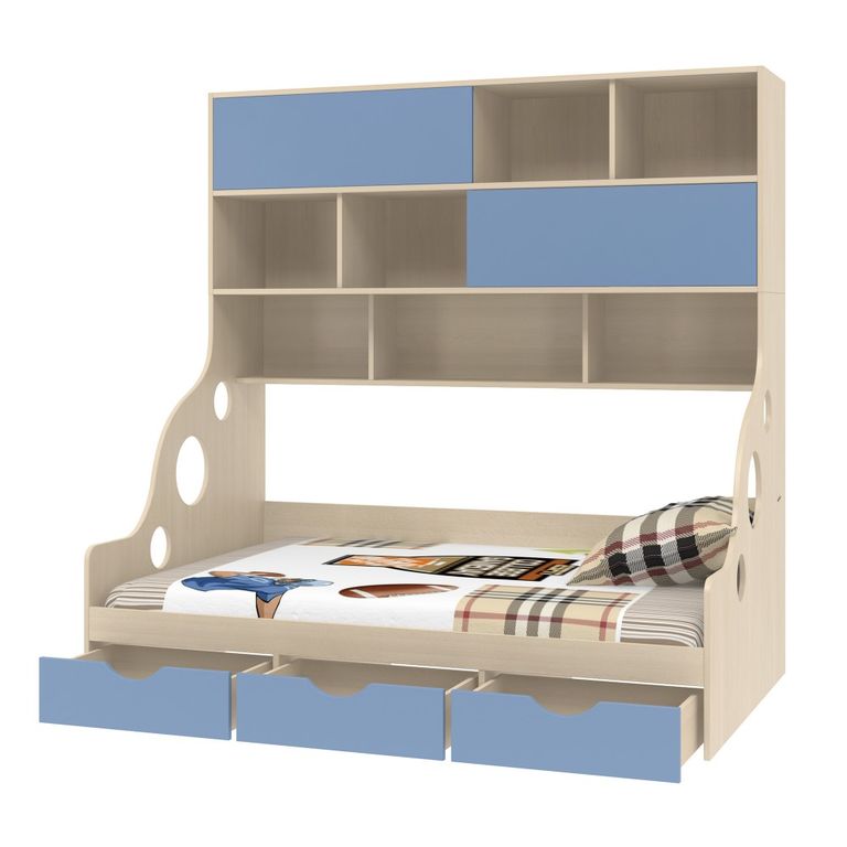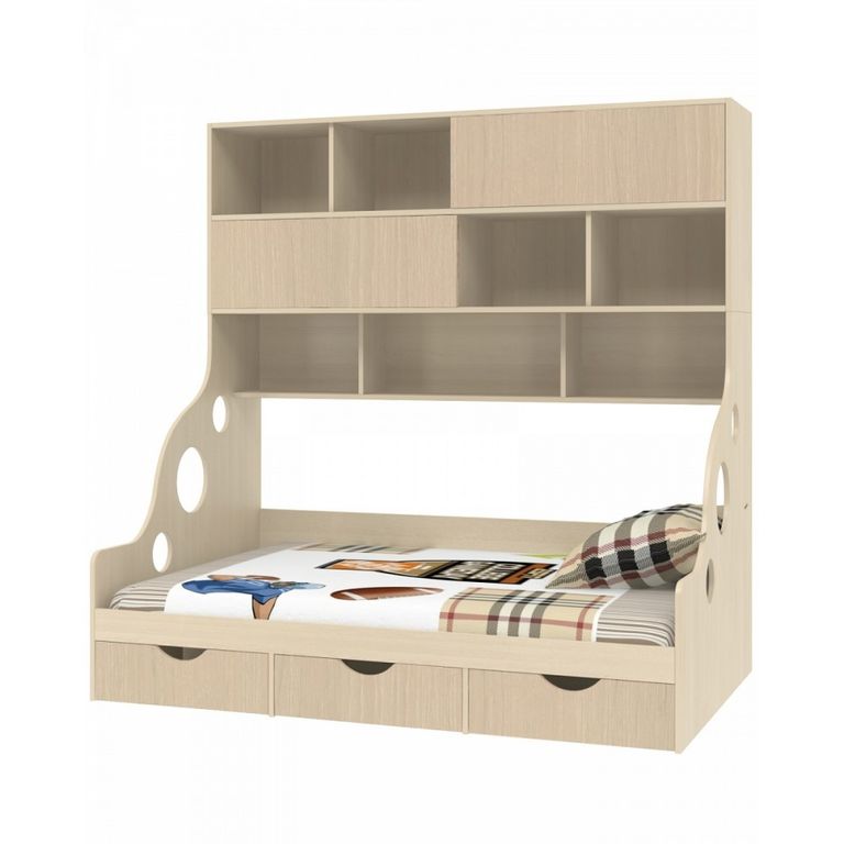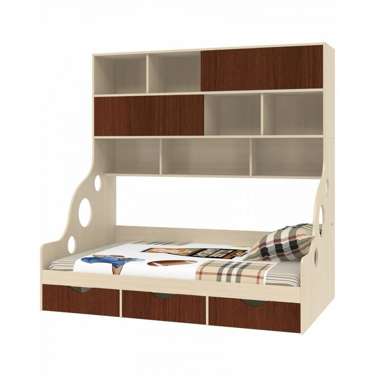 Кровать с антресолью Дельта - 21.02 - это удобный, функциональный комплекс, который состоит из расширенного спального места и блока антресолей. Антресоль состоит из открытых и закрытых за раздвижными дверями ниш, на которых можно разместить различные личные вещи. Под спальным местом расположены три выкатных ящика, в которых удобно хранить постельное белье, обувь или одежду.