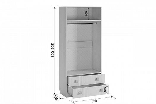 Состоит из трубы под одежду, полки и 2-х выдвижных ящиков.