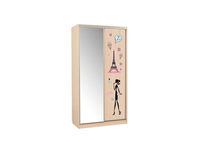 Внутреннее наполнение дверей- сочетание ЛДСП и зеркал с белым принтерным рисунком. Зеркала защищены противоосколочной пленкой. Сборка на одну сторону (полки справа).