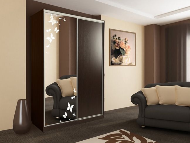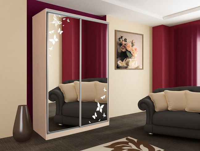 Внутреннее наполнение дверей- сочетание ЛДСП и зеркал с белым принтерным рисунком. Зеркала защищены противоосколочной пленкой. Сборка на одну сторону (полки справа).