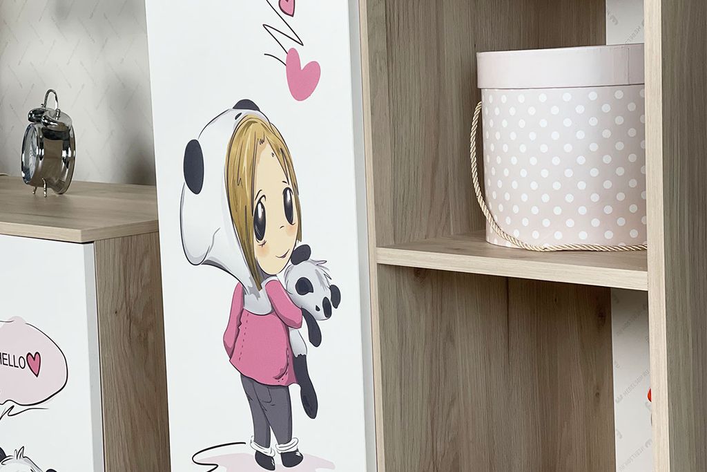 Стильный и модный стеллаж «Панда» позволяет разместить множество вещей на открытых и закрытых секциях. Модный и стильный рисунок на фасаде, придаст индивидуальность детской комнате, а тактильно приятные ручки-сердечки, очаруют каждую девочку. Принтерный рисунок устойчив к истиранию и ультрафиолету. Комплектуется дополнительным модулем "Полкой-вкладышем 49" и "Доводчиком для петли 4-х шарнирной".