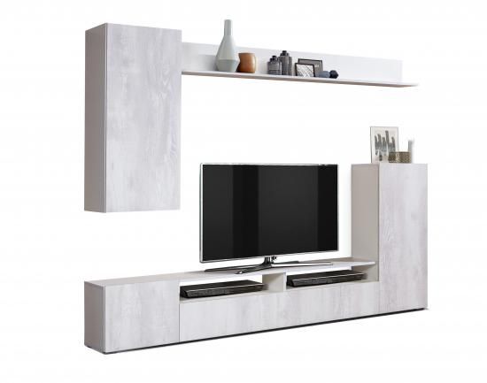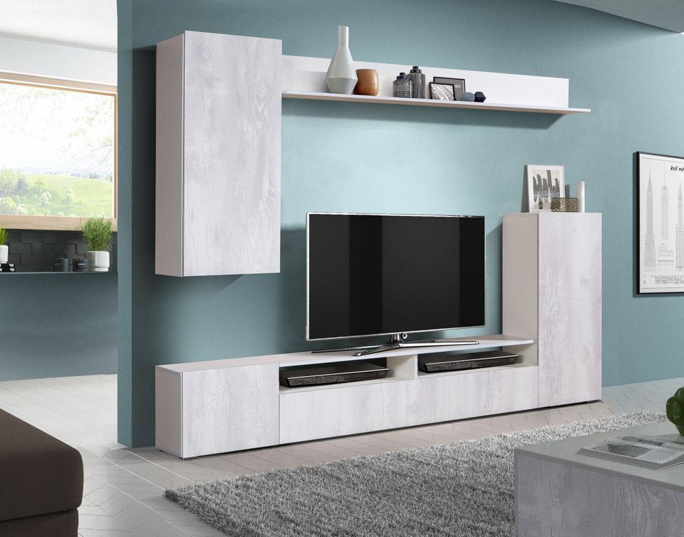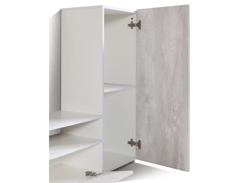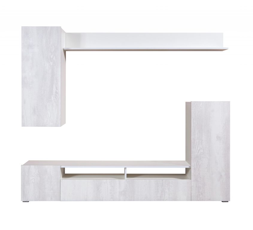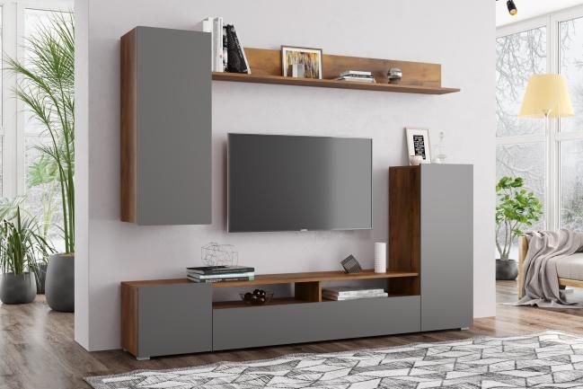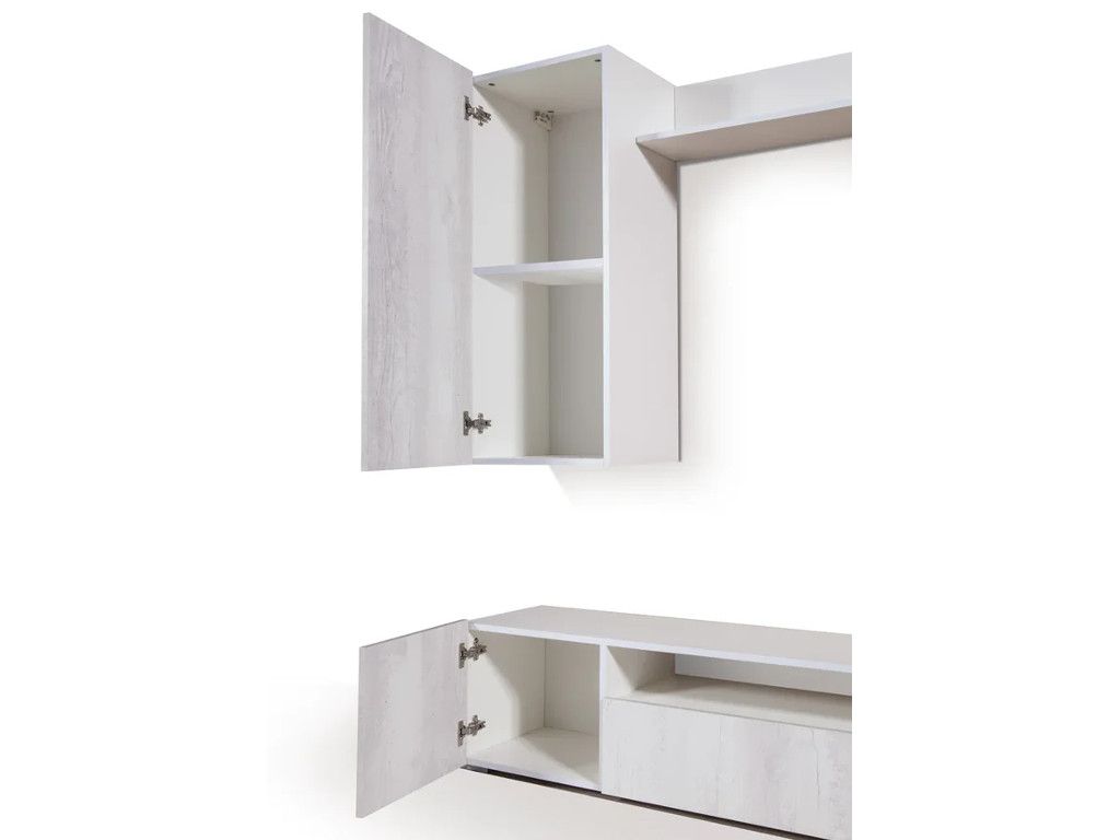 Слева и справа полки для хранения, в центре открытая полка и тумба для тв.