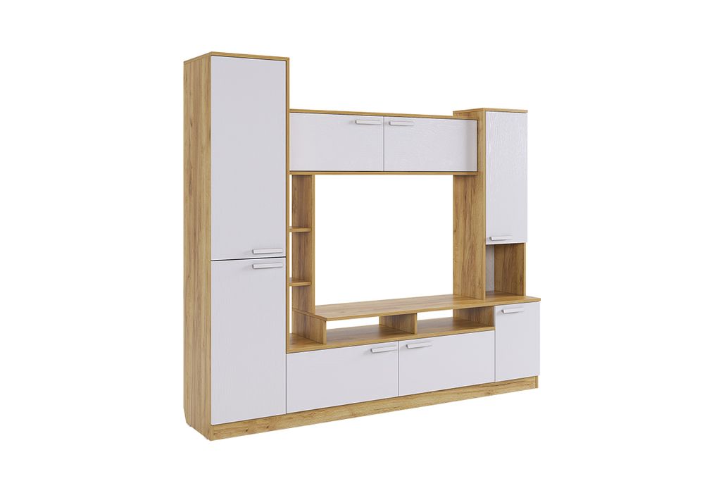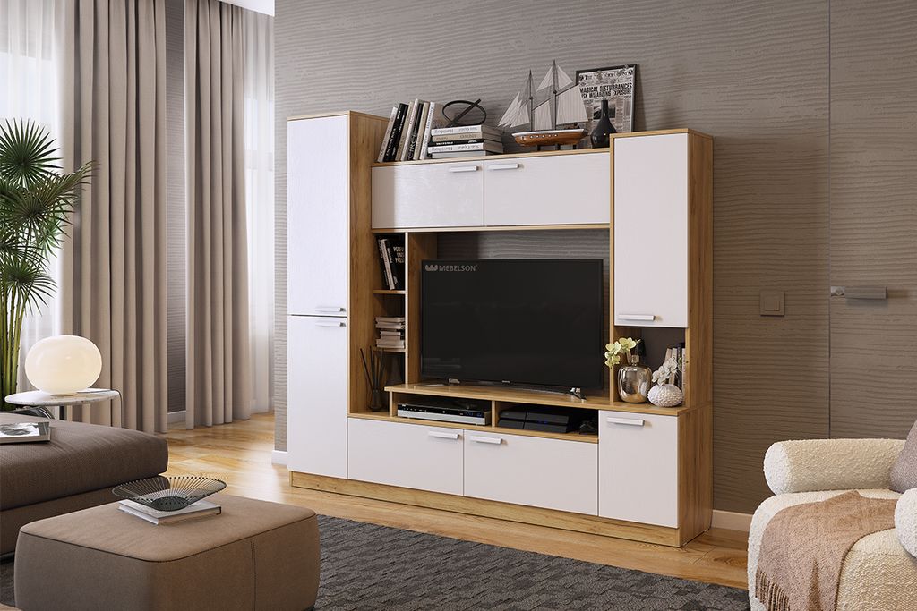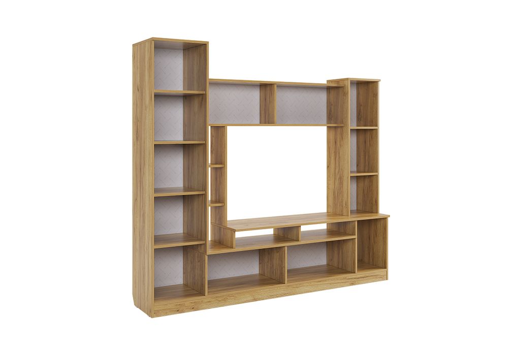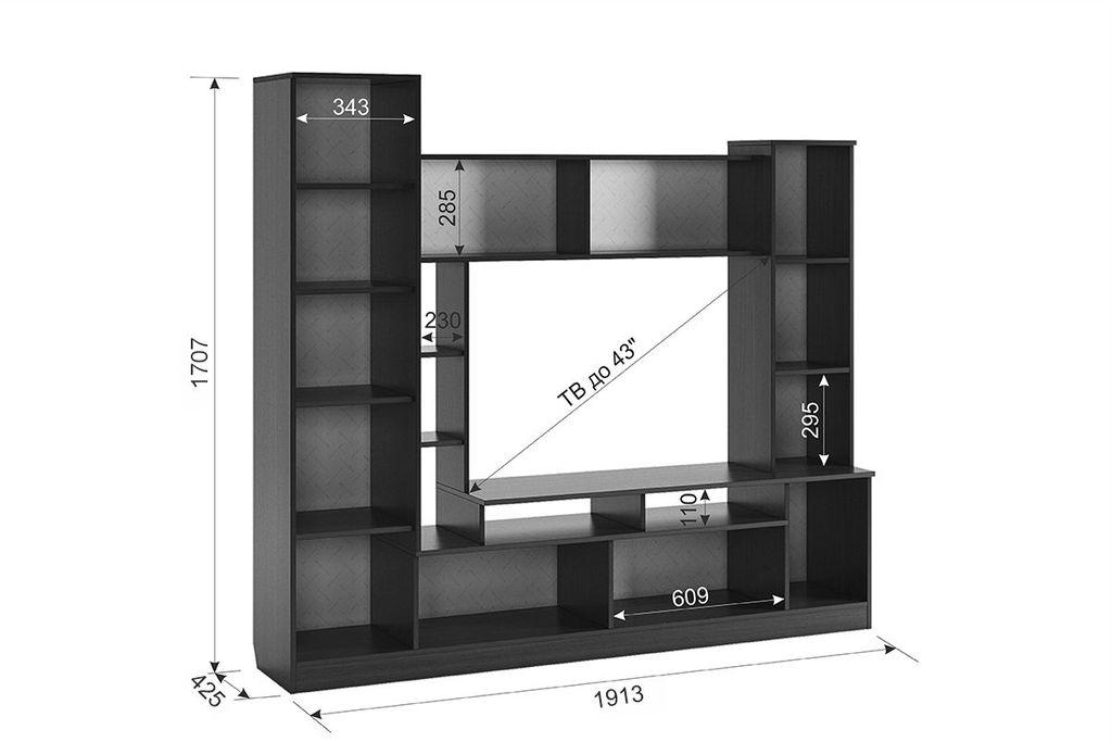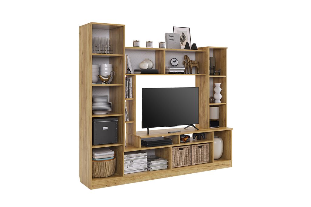 Мини-стенка очень функциональна: наличие множества открытых и закрытых полок позволит максимально использовать пространство. Есть ниша под телевизор диагональю до 43 дюймов.