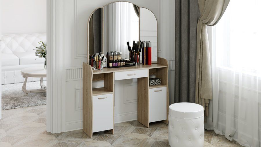 Универсальный туалетный столик «София Т2» — одна из самых вместительных моделей данной линейки столов и трюмо. Он воплощает в себе удобство и красоту в сочетании с доступной стоимостью и высоким качеством материалов
