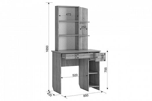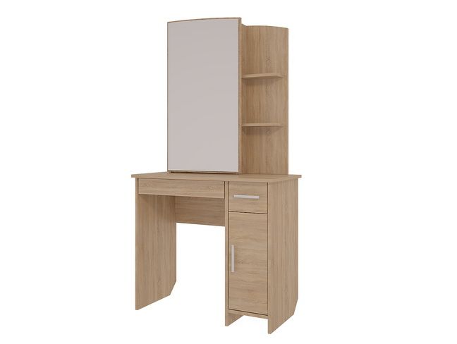 Трюмо «Виктория 1» выполнено в цвете дуб Сонома. Полки для парфюмерии и косметики, ящики для украшений, фена и мелочей.