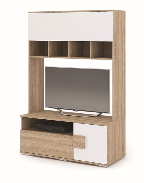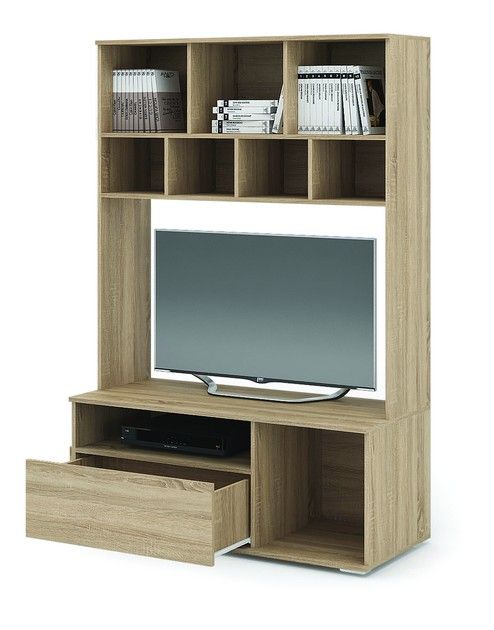 Центральная тумба под ТВ с вместительным выдвижным ящиком, удобной верхней зоной для хранения со створкой, нижней дверцей, открытыми полочками.